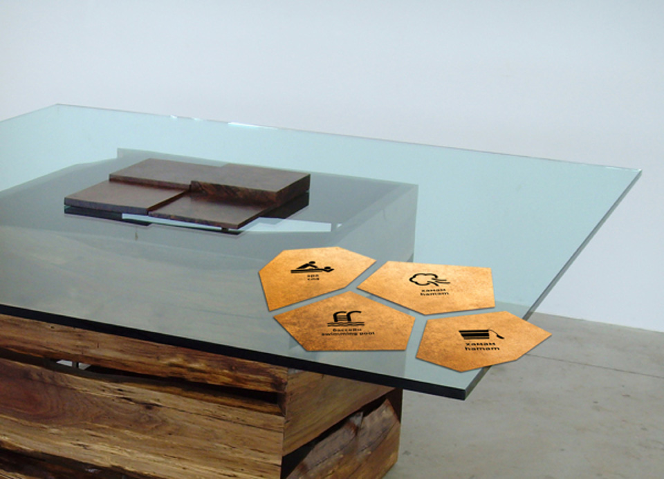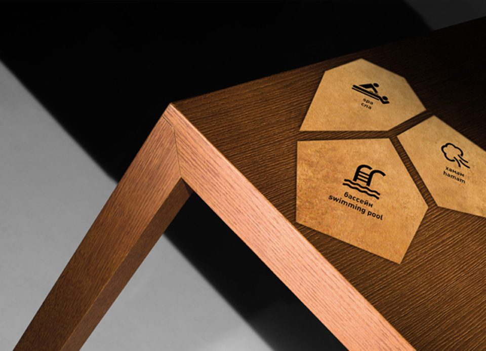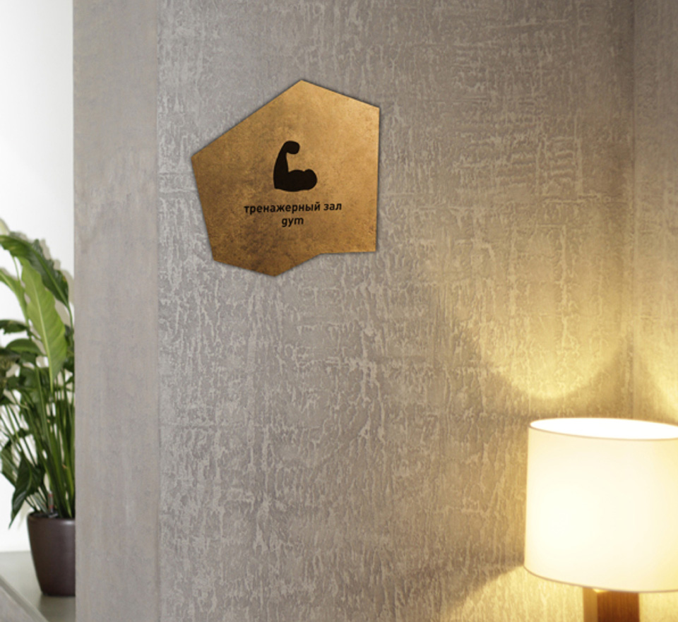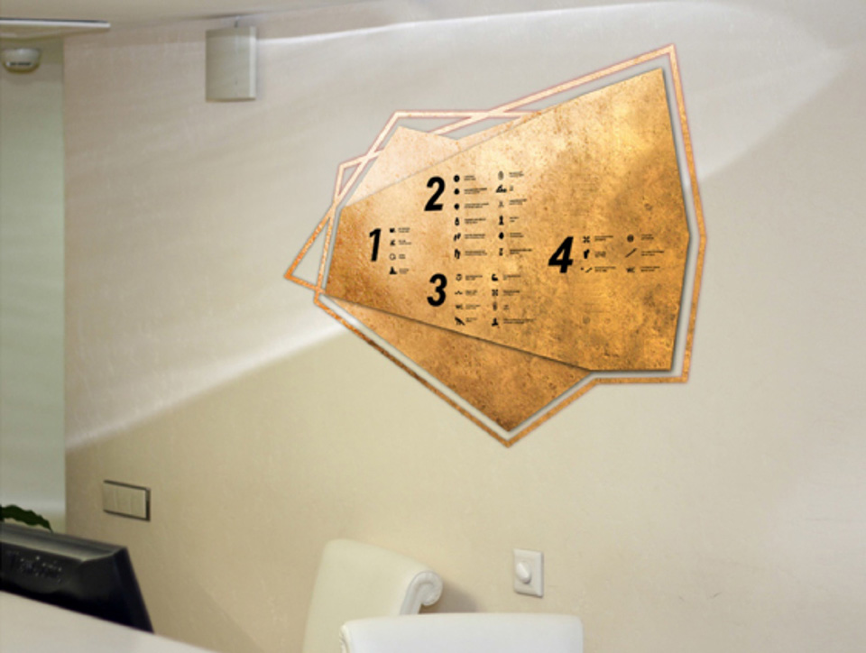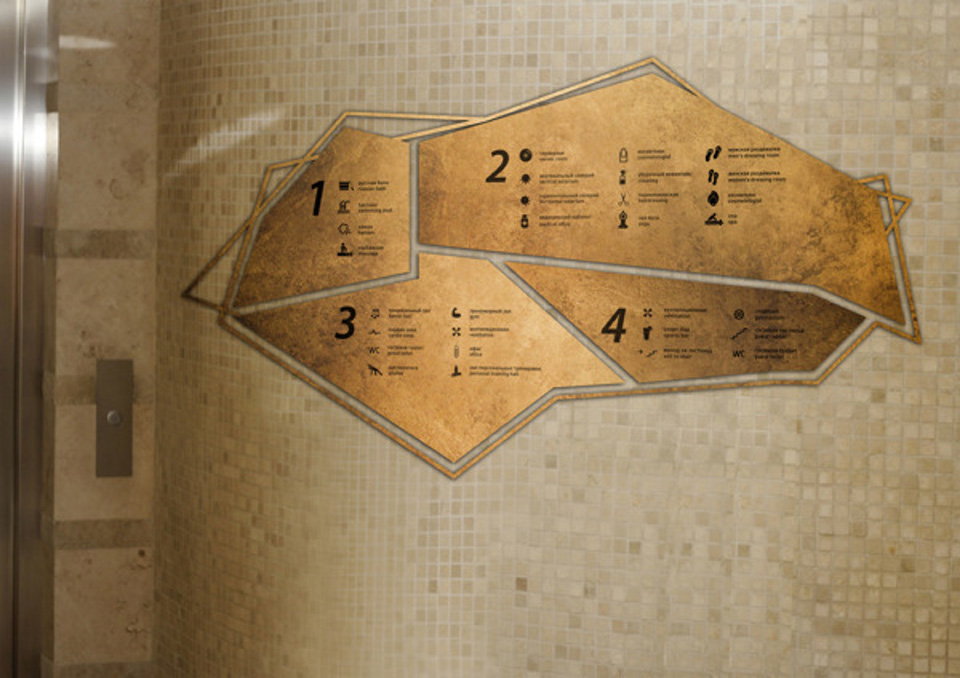 金色是一種材質(zhì)色,一種略深的黃色,是指表面極光滑(鏡面)并呈現(xiàn)金屬質(zhì)感的黃色物體的視覺(jué)效果,是高貴、輝煌的象征。在導(dǎo)視系統(tǒng)的設(shè)計(jì)中,金色的使用會(huì)比較有限,高檔會(huì)所是其聚集地,但在造型的選擇中,大多選擇華貴的花紋來(lái)襯托金色的華麗。下面這套導(dǎo)視在造型的選擇上卻別出心裁,不規(guī)則的圖形拼合的導(dǎo)視,充滿了古堡與博物館氣息。