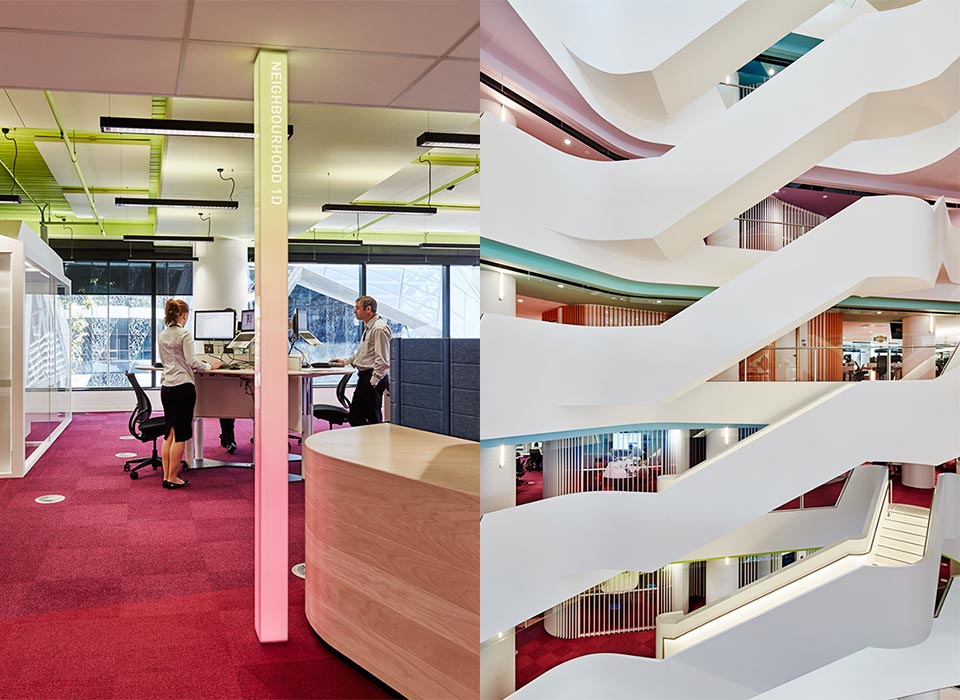Medibank是澳大利亞領先的醫療保險公司,Fabio Ongarato Design與建筑室內設計公司Hassell緊密合作創造了一個充滿設計與活力的現代先進工作場所,并提供了一套能配合提升建筑的導向系統,同時通過環境圖形來進行場景營造和工作場所的標識設計。