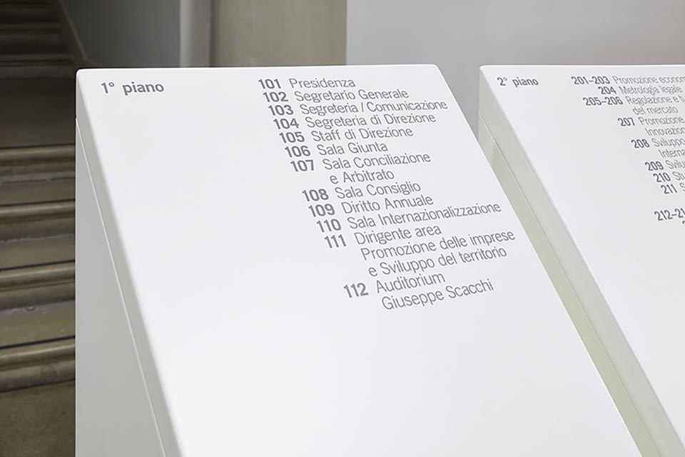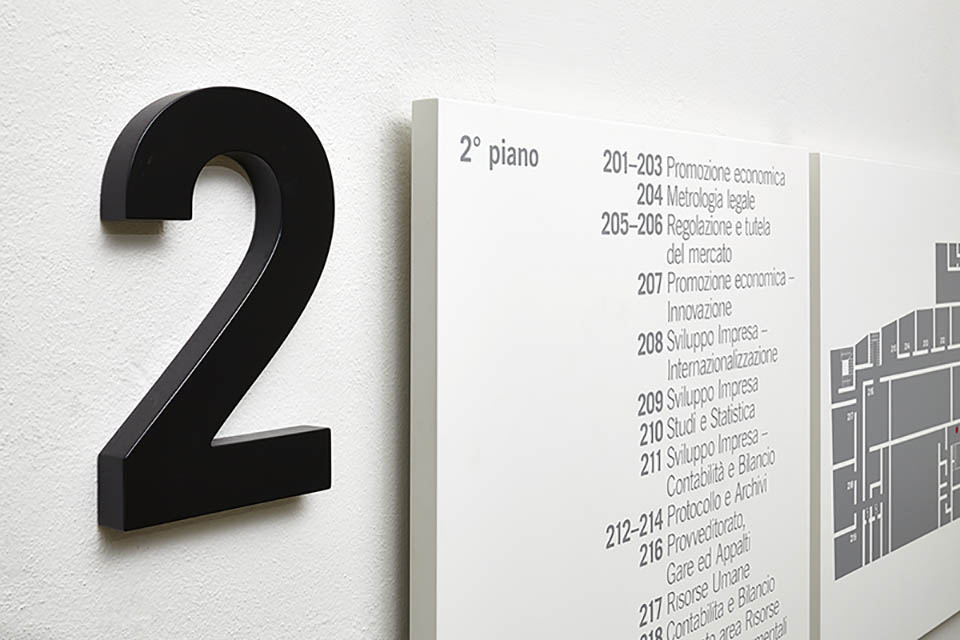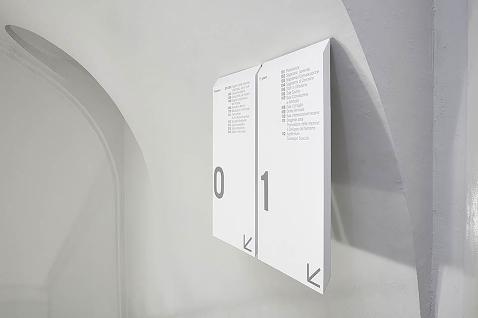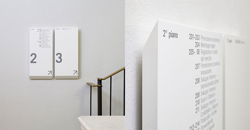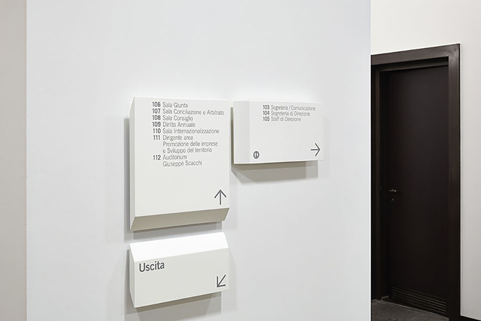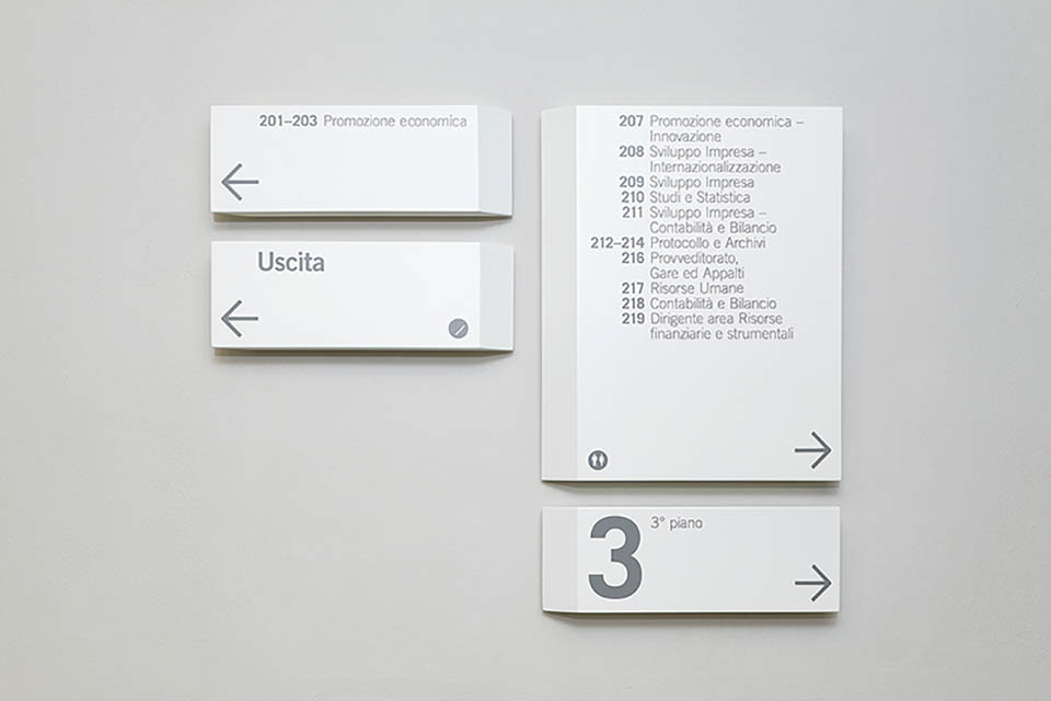 Como商會是一個獨立的公共權利機構,其使命是通過綜合調解商會和理事會代表的所有部門的需求促進經濟和發展商業體系和地方經濟。由于商會總部由幾座建筑風格和時代各異的建筑物組成。設計師以此為鑒,標牌系統的元素被設計為在建筑物中以橫向方式操作,以適應不同的功能需求。色調以白灰配合黑色為輔,文字和箭頭結合的引導形式加以應用,整體以布局直接、樸實的簡約風格展現,提供靈活地功能并保持中立性和決定性的特性。